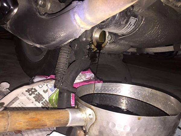 這不算苦差事.....不過專用換油盛接罐被人丟掉了...索性乾脆不用!!...硬是將盆墊高擠進中柱胯下...笑果還可以....